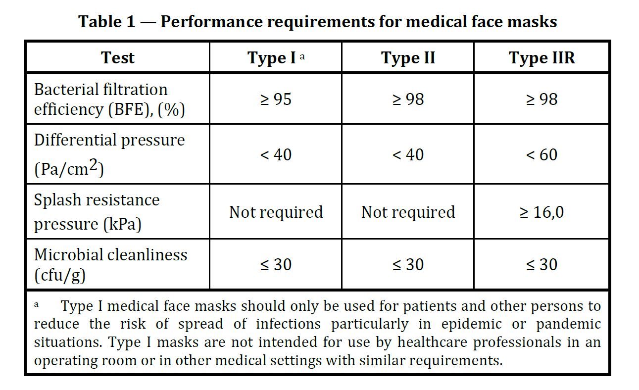 EN 14683標準可以分為三個等級,分別為Type Ia, Type II和Type IIR,各種參數的要求如下列附表:
